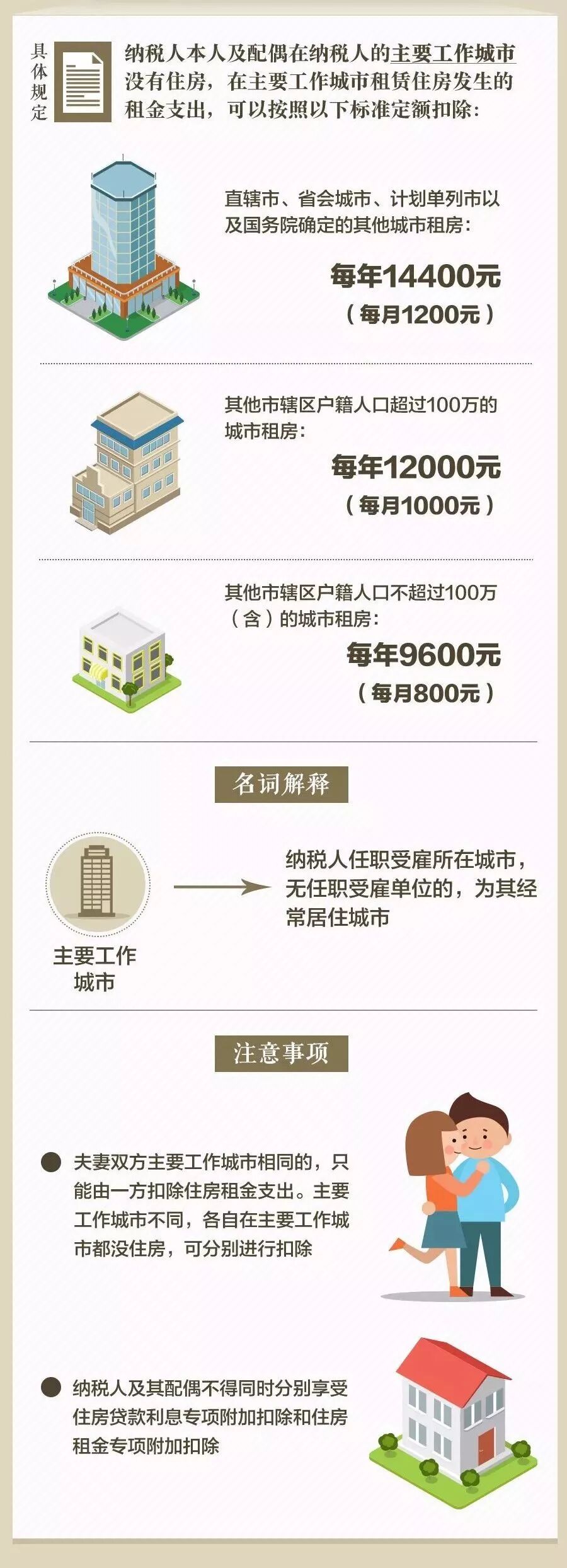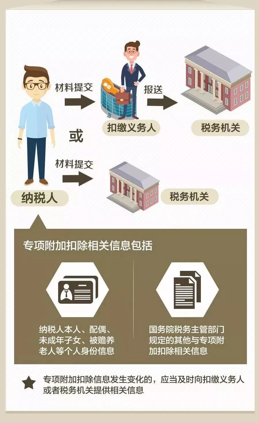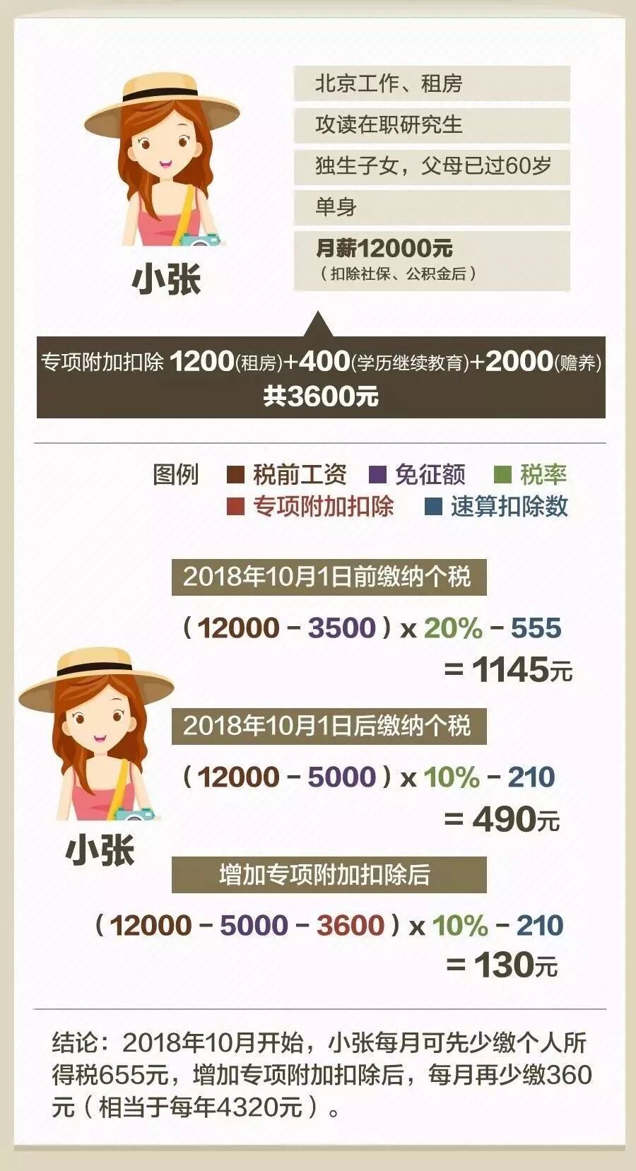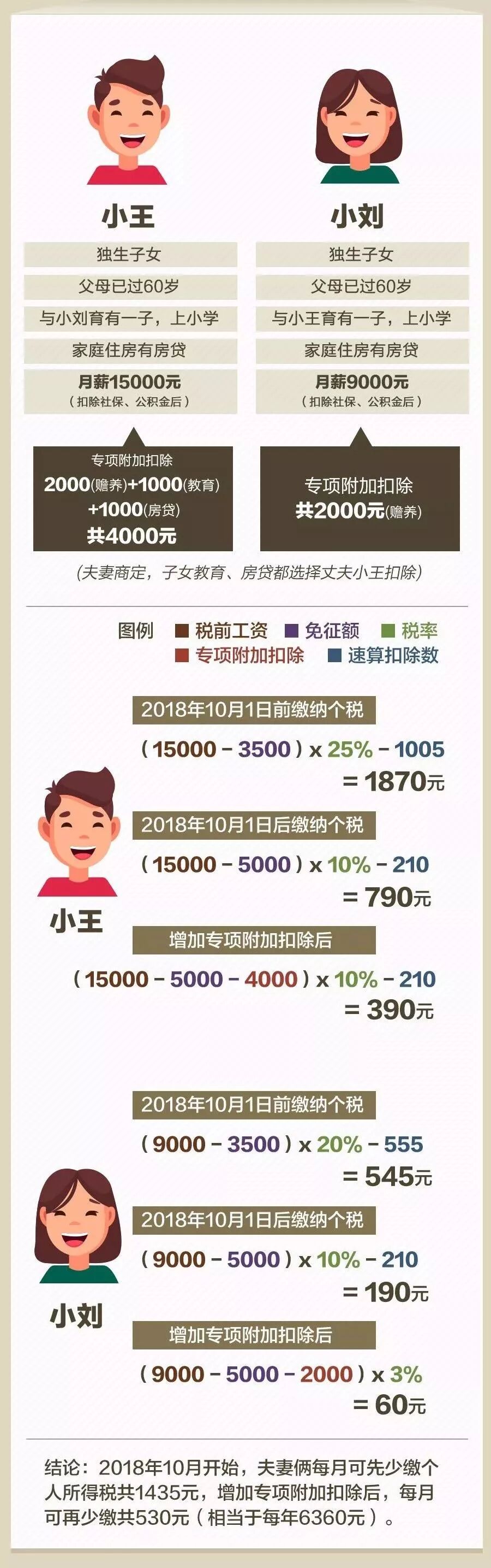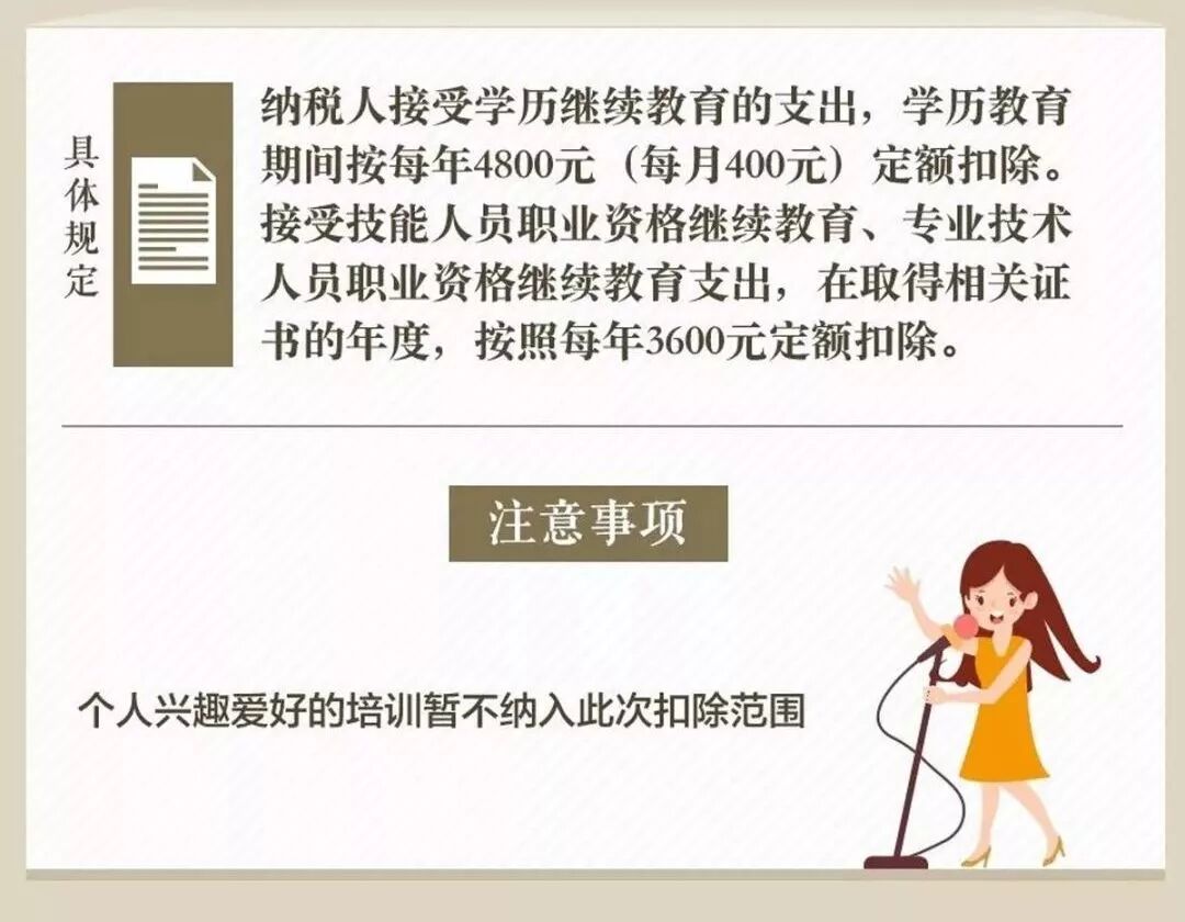 個(gè)稅專項(xiàng)扣除項(xiàng)的新政策真可謂舉國(guó)歡慶!我們財(cái)務(wù)人絕對(duì)是政策的主要受益對(duì)象! 一來(lái)我們財(cái)務(wù)人掙得少,但花多的呀; 二來(lái)我們財(cái)務(wù)人加班多,晚上要自學(xué)考各種證,周末還要進(jìn)行繼續(xù)教育呀; 三來(lái)我們財(cái)務(wù)女人多,不是在養(yǎng)娃就是在養(yǎng)娃的路上呀…… 現(xiàn)在的6大專項(xiàng)扣除,讓整天處于中年焦慮的財(cái)務(wù)人,稍微松了口氣。 針對(duì)個(gè)稅新政,很多小財(cái)主提出了疑問(wèn): 我考證的費(fèi)用、參加計(jì)繼續(xù)教育的錢(qián),都能抵扣嗎? 個(gè)稅專項(xiàng)扣除實(shí)施細(xì)則出臺(tái),該如何申報(bào)? 自己一年到底能省多少錢(qián),具體如何實(shí)施? 子女教育和贍養(yǎng)老人是否需要憑證? 專項(xiàng)扣除需發(fā)票? 又有新政策,我們是不是又要忙瘋? ...... 別急,這些問(wèn)題的答案都在下面的文章內(nèi)。 說(shuō)實(shí)在的,小好覺(jué)得這次的政策可謂是超出很多人的預(yù)料,給了很多工薪黨一個(gè)大大的驚喜! 貼心的小好為小主們重新整理了個(gè)稅專項(xiàng)扣除的細(xì)則:包含6項(xiàng)專項(xiàng)扣除每月(年)的扣除金額&注意事項(xiàng);以案例解析應(yīng)納稅所得額的計(jì)算公式;個(gè)稅附加項(xiàng)的申報(bào)2步走。 還有個(gè)稅專項(xiàng)扣除的18問(wèn)答以及個(gè)稅稅目稅率等。 小主們看完趕緊收藏~ 個(gè)稅專項(xiàng)扣除細(xì)則真相,多一大筆錢(qián) 今年個(gè)稅改革的最大亮點(diǎn),除了免征額上提到5000元外,還有就是新增加的6項(xiàng)專項(xiàng)扣除怎么實(shí)施! 索性在10月20日,國(guó)家公布的《個(gè)人所得稅專項(xiàng)附加扣除暫行辦法(征求意見(jiàn)稿)》中明確了這一點(diǎn): 今后計(jì)算個(gè)稅應(yīng)納稅所得額,在5000元基本減除費(fèi)用扣除和“三險(xiǎn)一金”等專項(xiàng)扣除外,子女教育、繼續(xù)教育、大病醫(yī)療、住房貸款利息或住房租金,以及贍養(yǎng)老人等專項(xiàng)附加扣除。 如果將專項(xiàng)附加扣除額用滿,萬(wàn)元月薪的納稅人將迎來(lái)“零納稅時(shí)代”,以往的“四座大山”——住房、醫(yī)療、教育、養(yǎng)老的壓力將大大減輕。 先來(lái)重溫一下細(xì)則的幾個(gè)重點(diǎn): 1. 納稅人本人或配偶發(fā)生的首套住房貸款利息支出,可按每月1000元標(biāo)準(zhǔn)定額扣除; 2. 住房租金根據(jù)納稅人承租住房所在城市的不同,按每月800元到1200元定額扣除; 3. 納稅人贍養(yǎng)60歲(含)以上父母的,按照每月2000元標(biāo)準(zhǔn)定額扣除; 4. 納稅人的子女接受學(xué)前教育和學(xué)歷教育的相關(guān)支出,按每個(gè)子女每年1.2萬(wàn)元(每月1000元)的標(biāo)準(zhǔn)定額扣除;納稅人接受學(xué)歷或非學(xué)歷繼續(xù)教育支出的,在規(guī)定期間可按每年3600元或4800元定額扣除; 5. 大病醫(yī)療方面,納稅人在一個(gè)納稅年度內(nèi)發(fā)生的自負(fù)醫(yī)藥費(fèi)用超過(guò)1.5萬(wàn)元部分,可在每年6萬(wàn)元限額內(nèi)據(jù)實(shí)扣除。 根據(jù)暫行辦法,個(gè)稅專項(xiàng)附加扣除遵循公平合理、簡(jiǎn)便易行、切實(shí)減負(fù)、改善民生的原則。 下面對(duì)照表格先看看自己可以減稅多少 通過(guò)這些扣除項(xiàng)目,納稅人可以少繳多少個(gè)稅?跟隨小好的步子,一起來(lái)算算。 個(gè)稅專項(xiàng)附加扣除讓你多拿多少錢(qián)? 01 子女教育專項(xiàng)扣除 每個(gè)子女每月1000元 這個(gè)舉措給有孩子的家庭減負(fù),子女教育專項(xiàng)扣除之后,可以省多少錢(qián),我們以小明為例: 02 繼續(xù)教育專項(xiàng)扣除 每年3600元或4800元 繼續(xù)教育,這對(duì)我們會(huì)計(jì)考證黨來(lái)說(shuō)確實(shí)是重大利好,無(wú)論是你選擇學(xué)歷教育還是職業(yè)資格繼續(xù)教育都能享受到福利,以后只要選擇考證,可能都會(huì)獲得減稅福利! 03 大病醫(yī)療專項(xiàng)扣除 每年60000元 如果看完定義還不清楚到底省多少錢(qián)的,我們?cè)賮?lái)看例子: 04 住房貸款利息專項(xiàng)扣除 每月1000元 買房子對(duì)于很多年輕人來(lái)說(shuō),都是一道過(guò)不去的坎,想買買不起,不買丈母娘不行,現(xiàn)在好了,國(guó)家出手了! 05 住房租金專項(xiàng)扣除 每月800-1200元 根據(jù)租房所在的區(qū)域劃分,專項(xiàng)扣免有所不同。這一點(diǎn)對(duì)于大多數(shù)的年輕人來(lái)說(shuō),真是開(kāi)心,因?yàn)閷?shí)實(shí)在在又省下一筆錢(qián)了! 還是以小明舉例: 06 贍養(yǎng)老人專項(xiàng)扣除 每月2000元 贍養(yǎng)老人,分為獨(dú)生子女和非獨(dú)生子女的情況: 一年少繳多少稅? 月入萬(wàn)元以下基本不用繳稅! 當(dāng)然,專項(xiàng)附加扣除并不能直接減免個(gè)人所得稅,而是要帶入一個(gè)公式里計(jì)算,最后的得數(shù)才是個(gè)人需要繳納的稅額。 公式看不太懂?沒(méi)關(guān)系,舉兩個(gè)實(shí)際生活中的例子,小主們就知道能夠節(jié)省多少了。 【案例1】 一對(duì)需要贍養(yǎng)老人、有孩子、有房貸的夫妻每年剩下6350元! 【案例2】 北漂單身女子,在北京工作、租房 這么算下來(lái),一年真的可以省下不少錢(qián)!很多人可能要“告別”個(gè)稅了! 既然國(guó)家給我們發(fā)了一個(gè)這么大