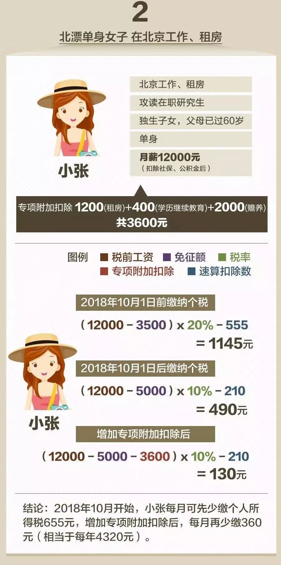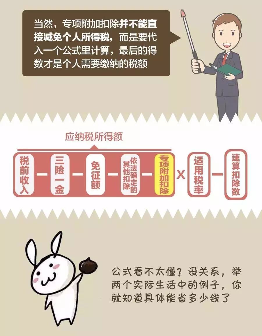 《暫行辦法》明確了個(gè)人所得稅法規(guī)定的子女教育、繼續(xù)教育等6項(xiàng)專項(xiàng)附加扣除的具體實(shí)施辦法。享受這些專項(xiàng)附加扣除,需要哪些條件?通過(guò)這些扣除項(xiàng)目,納稅人可以少繳多少個(gè)稅?跟隨下面這張圖,一起來(lái)算算。