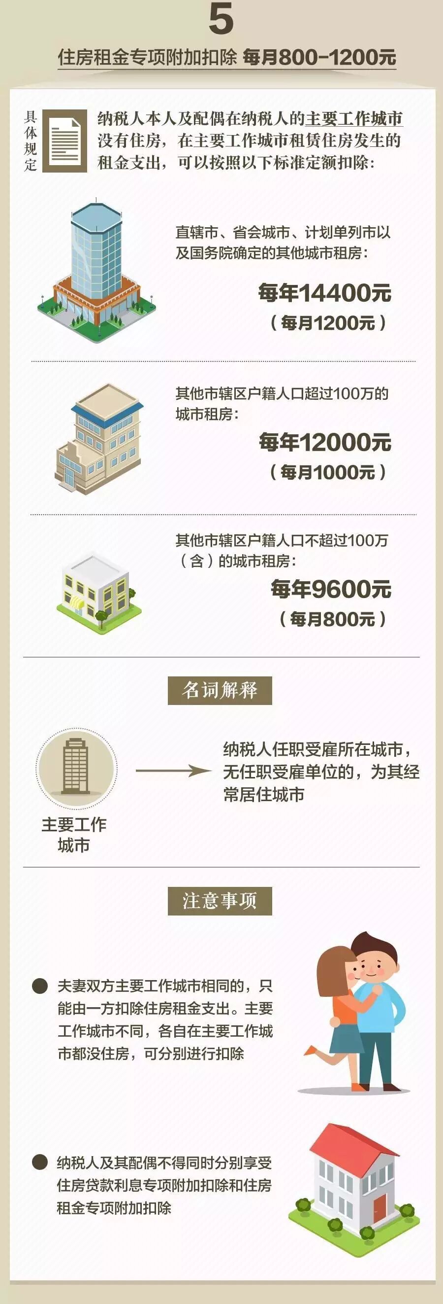 (三)承租的住房位于其他城市的,市轄區(qū)戶籍人口不超過(guò)100萬(wàn)(含)的,扣除標(biāo)準(zhǔn)為每年9600元(每月800元)。