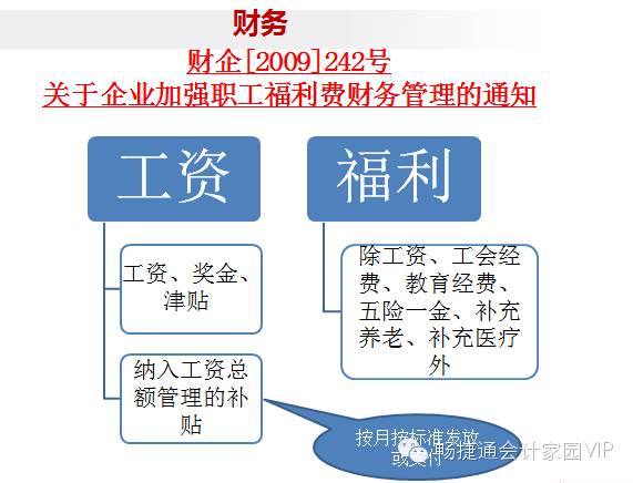 根據(jù)2015第34號(hào)公告這一點(diǎn)變化,現(xiàn)在我們發(fā)現(xiàn)對(duì)于小工資的核算,其實(shí)稅法和我們財(cái)政部的文件是保持一致了。為什么這樣說呢?因?yàn)樨?cái)政部它有一個(gè)文件,專門描述你企業(yè)發(fā)給員工到底哪些屬于工資,哪些屬于福利,這個(gè)文號(hào)就是財(cái)計(jì)的2009第242號(hào)文,對(duì)于工資這樣界定的,財(cái)政部對(duì)于工資,以下這樣界定的,工資包括什么呢?一,工資、獎(jiǎng)金、津貼;二,納入工資總額管理的補(bǔ)貼,而什么是納入工資總額管理的補(bǔ)貼呢?這就是按月按標(biāo)準(zhǔn)發(fā)放或支付的,這樣看來對(duì)于小工資的核算范圍,財(cái)政部的2009第242號(hào)文,和我們剛剛學(xué)習(xí)的總局2015第34號(hào)公告完全是一致的,那對(duì)于小工資核算的具體有哪些內(nèi)容,和我們財(cái)務(wù)交互處理是否一致我們現(xiàn)在就不用擔(dān)心了,你財(cái)務(wù)只要按照財(cái)政部的制度做,所得稅也用不著做任何調(diào)整。