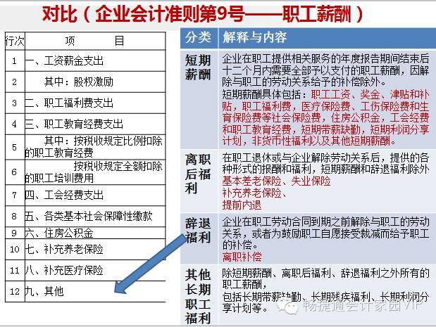 但是如果我們財(cái)務(wù)核算依據(jù)的是企業(yè)會(huì)計(jì)準(zhǔn)則,也就是大準(zhǔn)則,依據(jù)的是最新的會(huì)計(jì)準(zhǔn)則第九號(hào)職工薪酬,你就會(huì)發(fā)現(xiàn)你財(cái)務(wù)核算對(duì)于職工薪酬的分類,和我們申報(bào)表,就完全找不到對(duì)應(yīng)關(guān)系了。那準(zhǔn)則第九號(hào)它對(duì)于職工薪酬的分類,首先是分為四大類,短期薪酬,離職后辭退福利和其他長(zhǎng)期職工福利,最后我們申報(bào)表的明細(xì)項(xiàng)目,完全不是一套標(biāo)準(zhǔn)了,這個(gè)時(shí)候怎么處理呢?很簡(jiǎn)單,你把我們按照第九號(hào)職工薪酬準(zhǔn)則的四大分類,重新去看它每一類的核算內(nèi)容,然后把這些內(nèi)容再按照申報(bào)表的九個(gè)項(xiàng)目,重新去進(jìn)行一下分類。