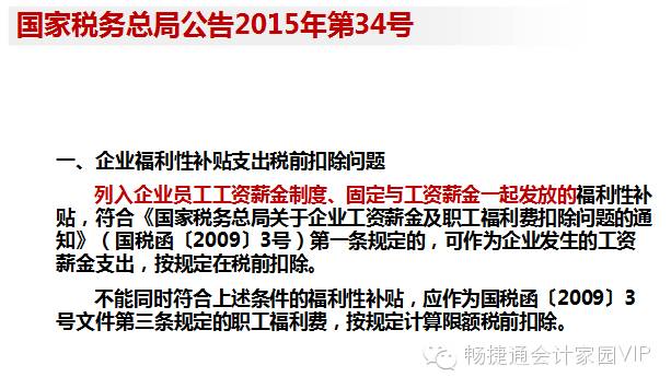 如果是在去年這兩項(xiàng)屬于福利費(fèi),不能作為小工資列支,但是今年政策發(fā)生變化,這個(gè)變化的文件就來源于2015第34號(hào)公告,我們念一下這個(gè)公告中重要的部分。關(guān)于企業(yè)福利性補(bǔ)貼的稅前扣除問題,它這樣說的,列入企業(yè)員工的工資薪金制度,固定的與工資薪金一起發(fā)放的福利性補(bǔ)貼,只要你符合我們國(guó)稅2009第一條三號(hào)規(guī)定,這里首先要復(fù)習(xí)一下,2009第一條三號(hào)規(guī)定,其實(shí)說的含義是,如果企業(yè)是屬于企業(yè)發(fā)放的,又合理的工資,允許在所得稅稅前扣除。