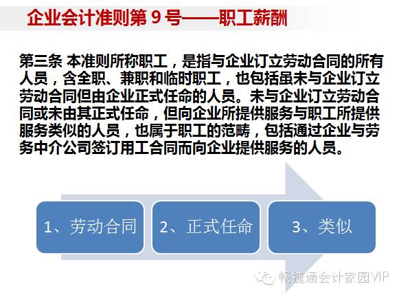 而且最最特別的是,最最政策寬松的是,除了這兩類人以外,會(huì)計(jì)準(zhǔn)則第九號(hào)職工薪酬還認(rèn)為,如果存在第三類人,對(duì)于第三類人,企業(yè)既沒有跟他簽勞動(dòng)合同,也沒有對(duì)他進(jìn)行正式任命,但是他所做的工作和前兩類人,和簽勞動(dòng)合同的那部分員工以及和正式任命的員工,做的工作性質(zhì)非常類似,那這類人,也是屬于我們的員工,我們企業(yè)給他的支付也是屬于工資薪金的,這樣看來,其實(shí)依據(jù)會(huì)計(jì)準(zhǔn)則第九號(hào)職工薪酬而言,我職工薪酬的范圍是非常寬泛的,這個(gè)三類人,全都屬于職工薪酬了。