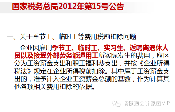 到這我們來看一下,依據(jù)我們總局的2012第15號(hào)公告,還有2015年的第34號(hào)公告,對(duì)于臨時(shí)工問題,我們完全可以先按職工薪酬福利費(fèi)進(jìn)行處理,當(dāng)?shù)囟悇?wù)機(jī)關(guān),它可能對(duì)于臨時(shí)工工資、季節(jié)工工資,有自己管理要求的,我們?cè)侔凑债?dāng)?shù)囟悇?wù)機(jī)關(guān)的管理要求去做。